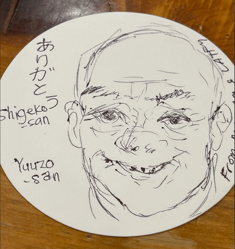 They were somehow impressed with my sketching. I told them I could sketch all night after my third failed attempt on the wife’s portrait. I asked for their names to write on the coaster. Chef’s name is Yuuzo-san. Wife’s name Shigoku-san.